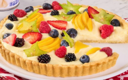 Pour the filling over the tart crust, and decorate with the peach slices, starfruit, blueberries, blackberries, strawberry slices, and raspberries. Enjoy.